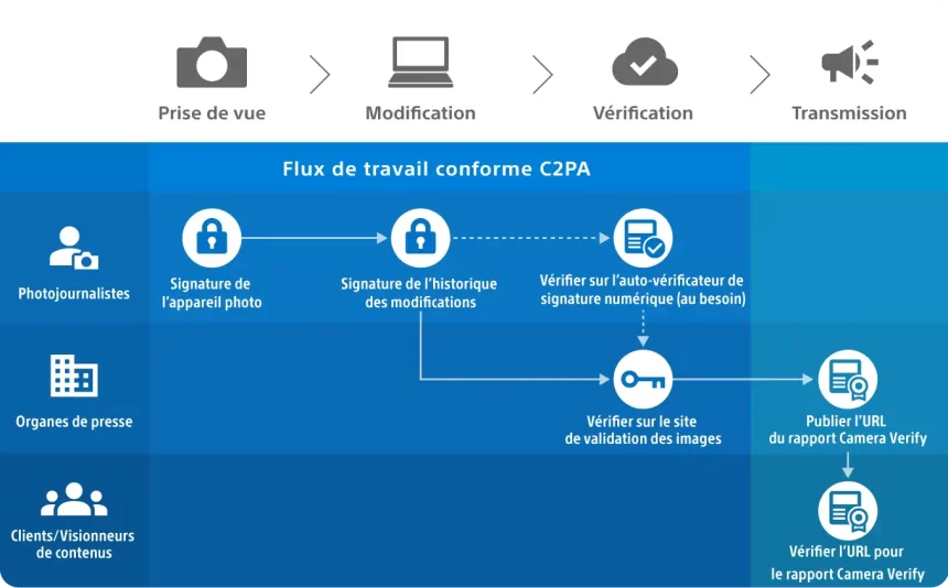 Le standard C2PA (Coalition for Content Provenance and Authenticity), porté par Adobe, Microsoft et de grands médias internationaux, définit un protocole ouvert pour certifier la provenance du contenu numérique. Sony l’a intégré directement dans ses appareils — ce qui change tout.