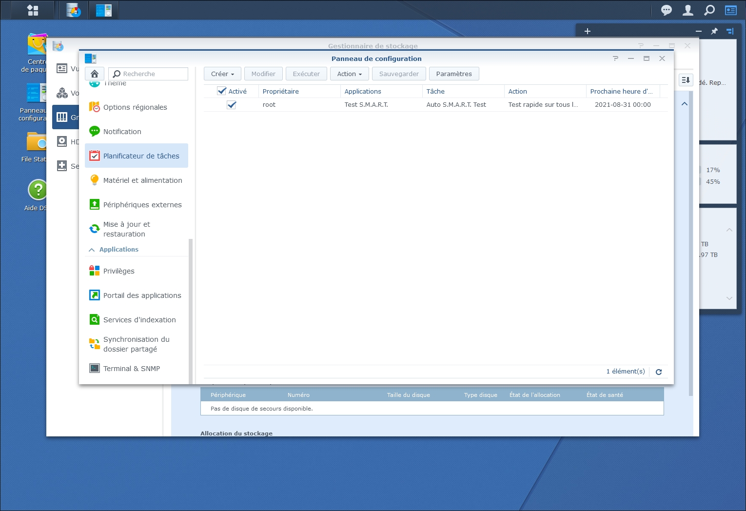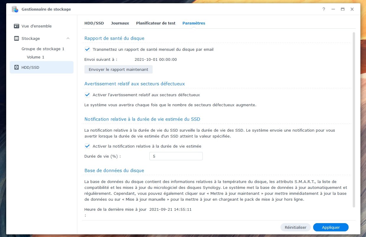 Il est important d’anticiper les pannes en surveillant régulièrement la santé des disques durs de votre NAS. Dans le planificateur de tâches vous pouvez configurer un Test S.M.A.R.T à intervalle régulier et recevoir un rapport de santé par e-mail.