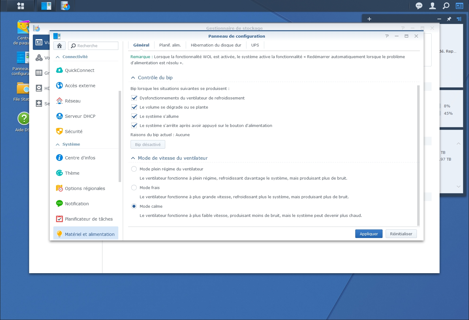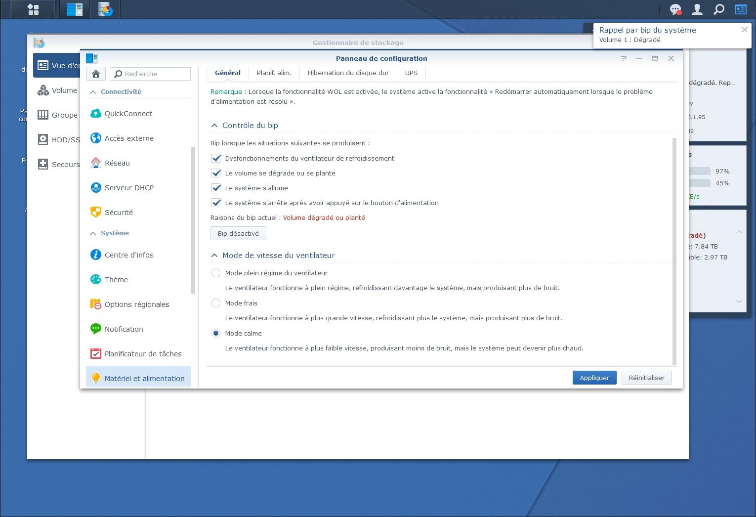 Cette opération peut prendre plusieurs heures en fonction de la taille de votre stockage. Durant cette phase, il est recommandé d’éviter de trop solliciter le NAS. Pensez à désactiver l’extinction si l’arrêt et le redémarrage sont automatiques.