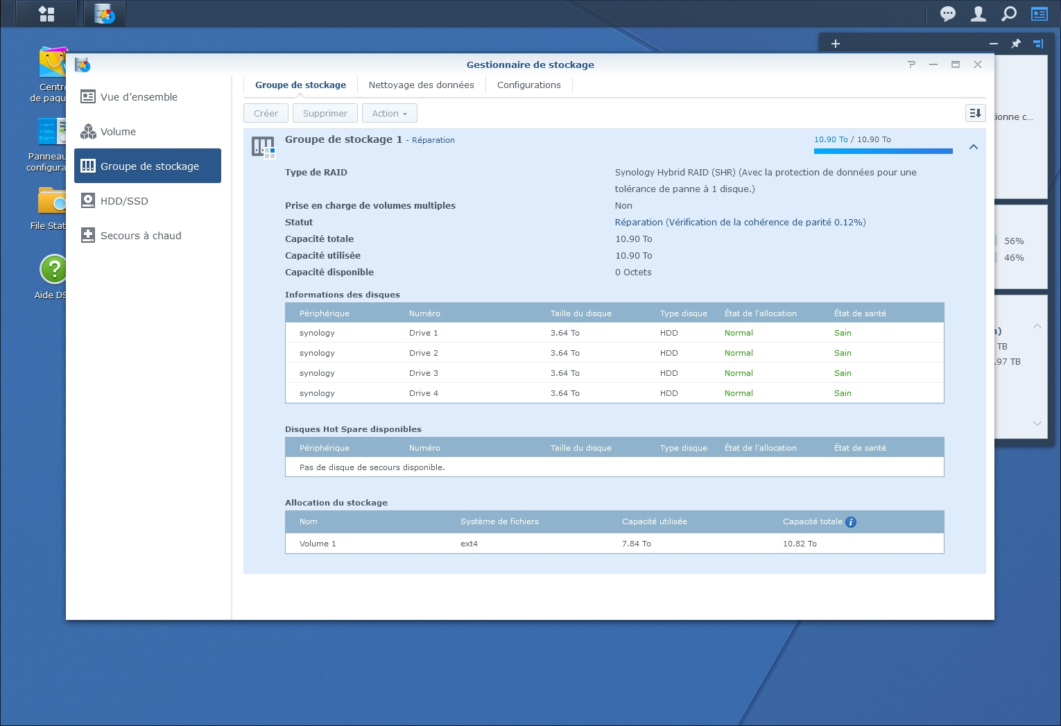 Une fois sur l’interface DSM, vous êtes automatiquement redirigé vers le Gestionnaire de stockage. Allez sur Groupe de stockage, sélectionnez le groupe dégradé puis allez sur Action et cliquez sur Réparer.