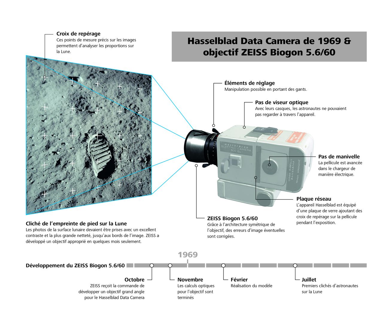 La netteté et la brillance des images parlent d’elles-mêmes : sur l’image fortement agrandie du « Man-on-the Moon », même les petits détails restent hautement résolus et contrastés, comme en témoignent les minuscules caractères sur la combinaison spatiale. À partir des prises de vue panoramiques détaillées, on a créé une carte exacte de la zone d’alunissage. La qualité de l’équipement photographique, ainsi que son fonctionnement facile et adapté aux circonstances difficiles, étaient les conditions essentielles pour de nombreuses prises de vue iconiques des missions lunaires.